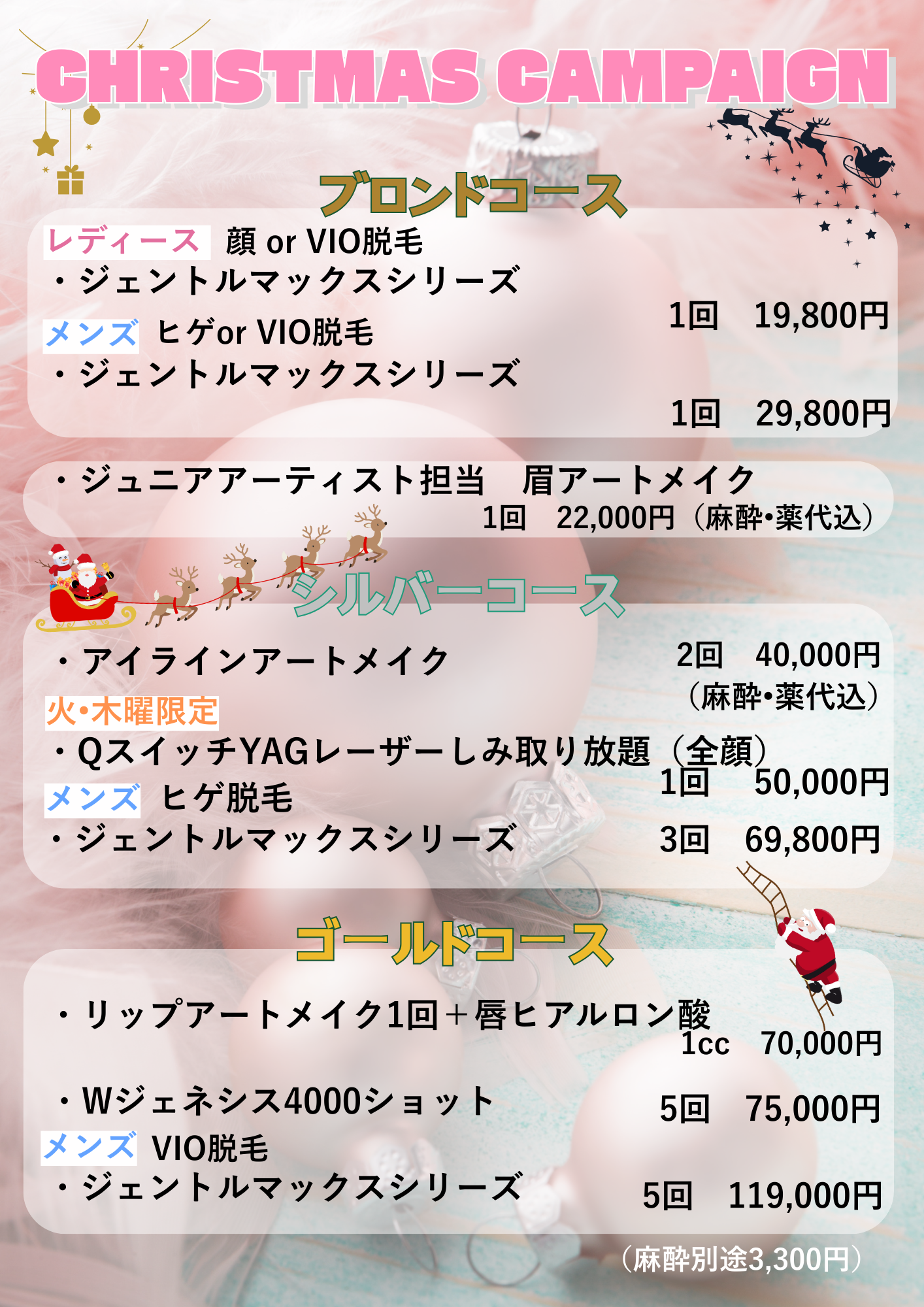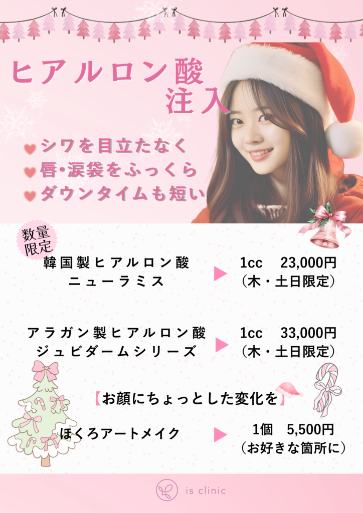 2025.12.01お知らせ12月キャンペーンのお知らせです!12月キャンペーンのお知らせです! 大人気のヒアルロン酸の施術がかなりお得に受けられます! その他、最近じわじわ流行りだしているホクロのアートメイクも通常価格の半額でお受けできます。 クリスマスキャンペーンと合わせてご契約も可能でございますので、この冬、お顔にちょっとした変化をつけたい方向けのプチ整形施術、ぜひお得な期間に試してみてください。 ツイート